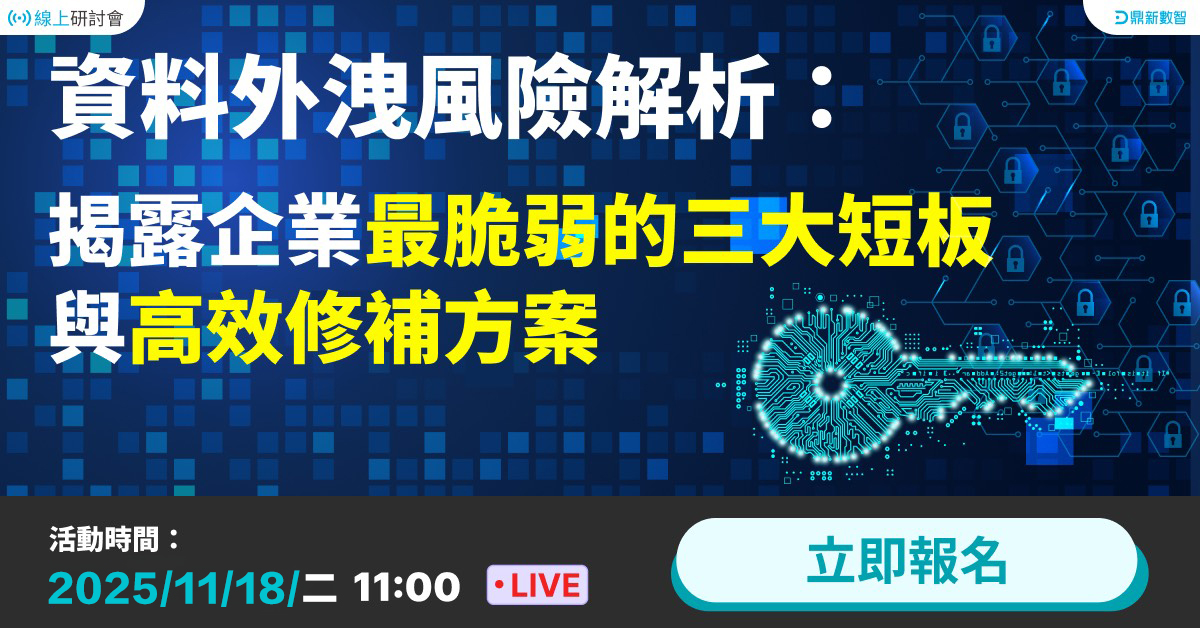 在數位化與雲端服務普及的時代,企業資料外洩事件層出不窮。 有些來自外部威脅──駭客滲透、釣魚郵件、惡意連線; 更多時候,卻是來自內部風險──權限控管鬆散、雲端設定錯誤、員工誤觸機密資料。 看似微小的疏忽,往往成為資料外洩的破口。本場研討會將從實務角度出發,帶您全面解析資料外洩的三大來源與脆弱環節,並以「短板改進 → 結構改善 → 長期規劃」三階段模型,帶您一步步掌握資料防護的優化路徑。 我們也將分享真實企業的防護改善案例,並提供活動限定的改善起手方案,協助您以最有效率的資源投入,快速補齊關鍵缺口、提升整體防護成熟度。💡您將收穫:了解企業最常見的內外部資料外洩風險掌握可落地的資料防護改善路徑與優先順序以合理預算補強環境缺口、強化資料安全體系一、內外夾擊的資料風險:企業最容易忽略的外洩管道 二、從補洞到防洩:三階段資料防護改善路徑三、啟動改善行動:用最有效的資源補上防護缺口